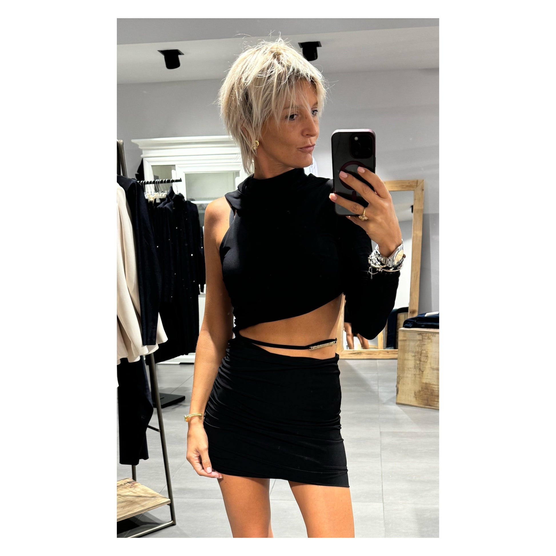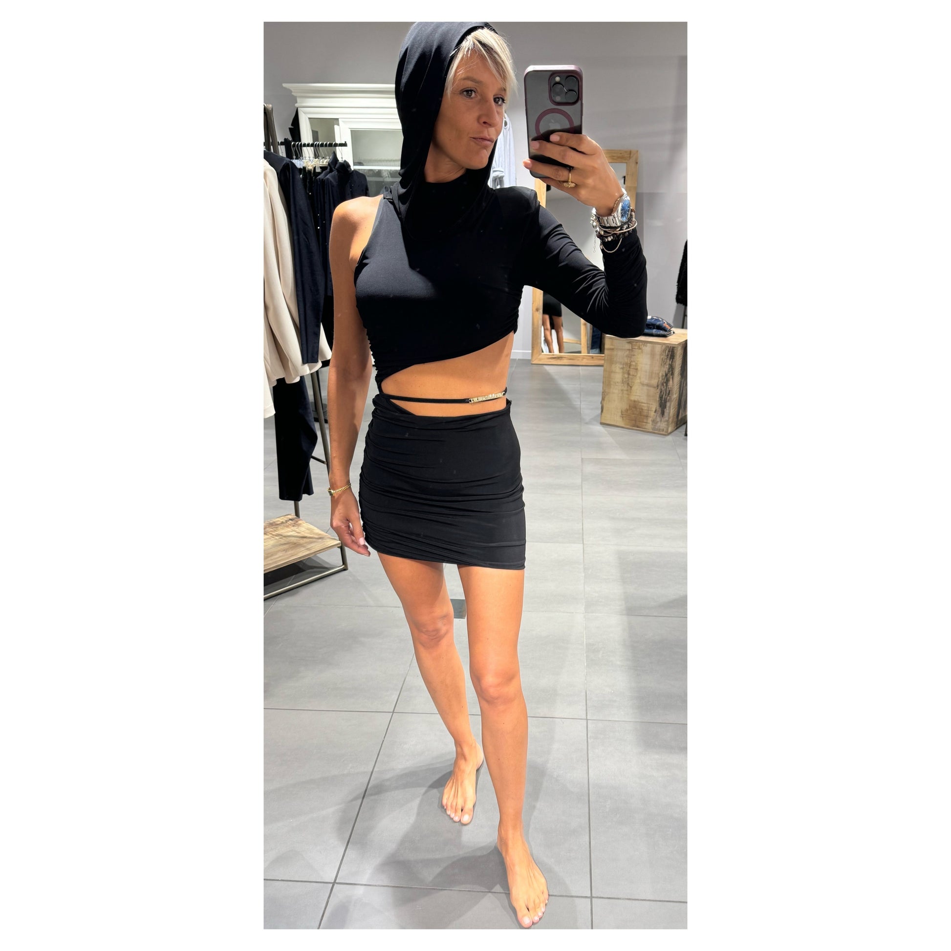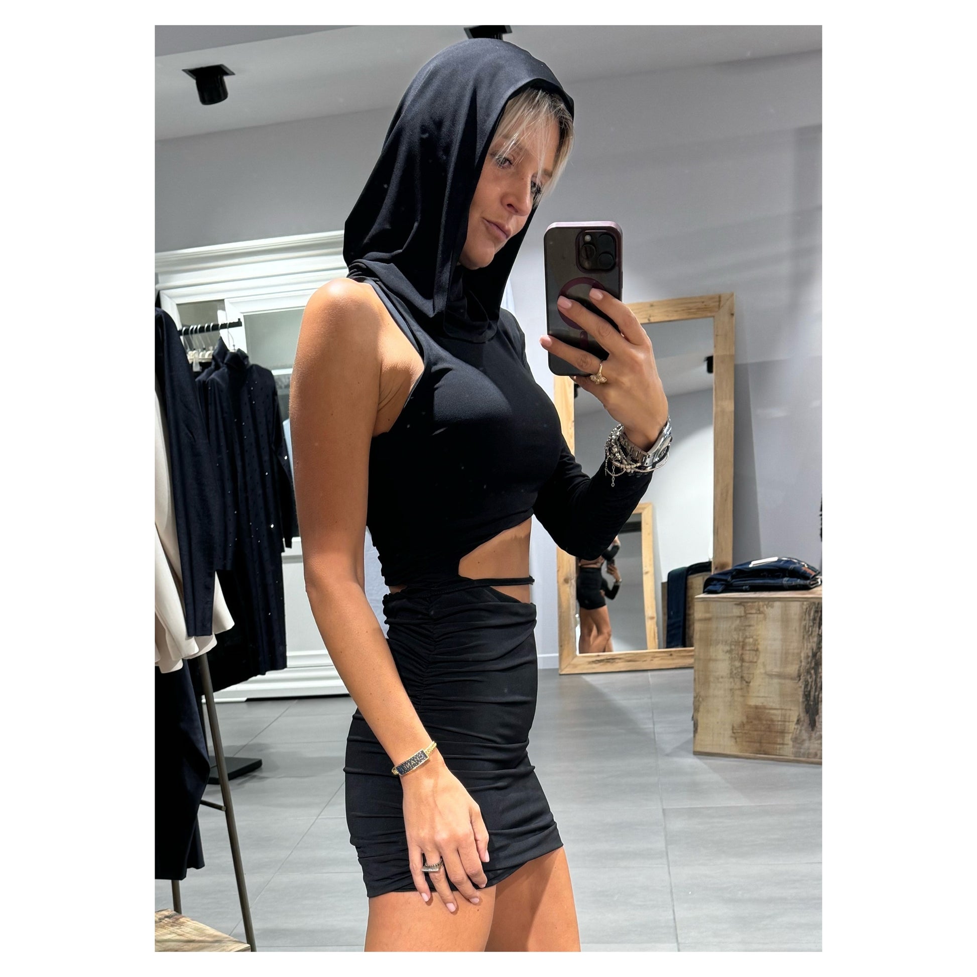 Abito mini in Jersey con cappuccio che sceso arricchisce il collo come una sciarpina. Modello monospalla con gonna arricciata e cut out con dettaglio gioiello logato
