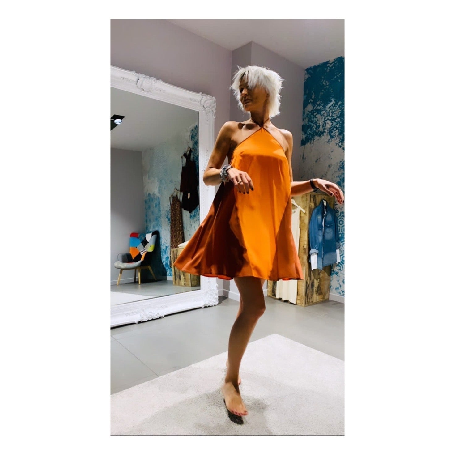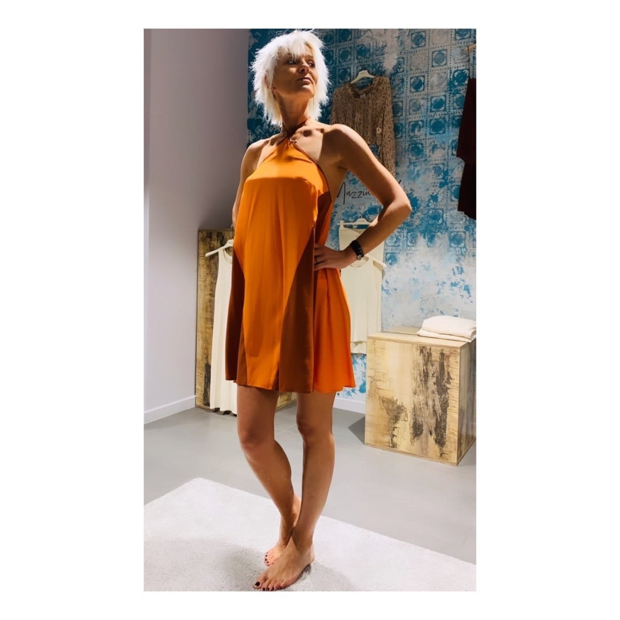 Abito corto schiena scoperta e adattabile grazie alla spallina regolabile con nodo sul collo.