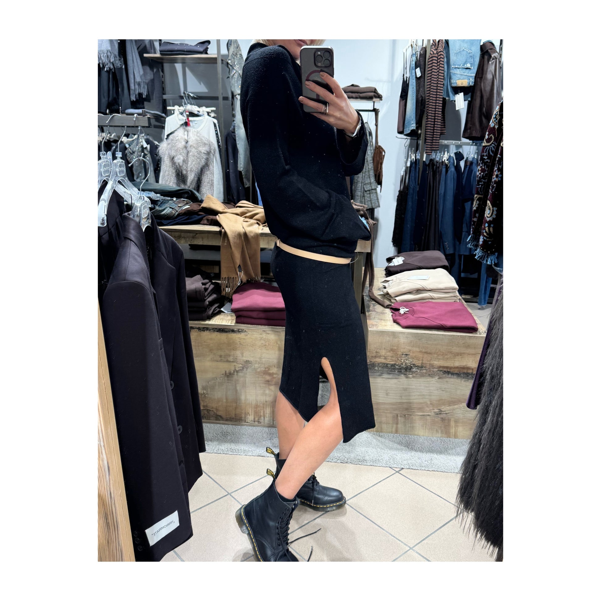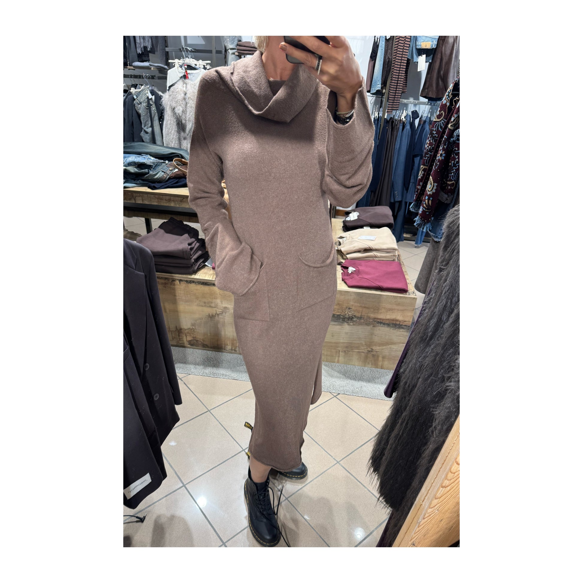 Abito in misto viscosa calda con spacchetti laterali e collo morbido a cascata con tasche frontali.
