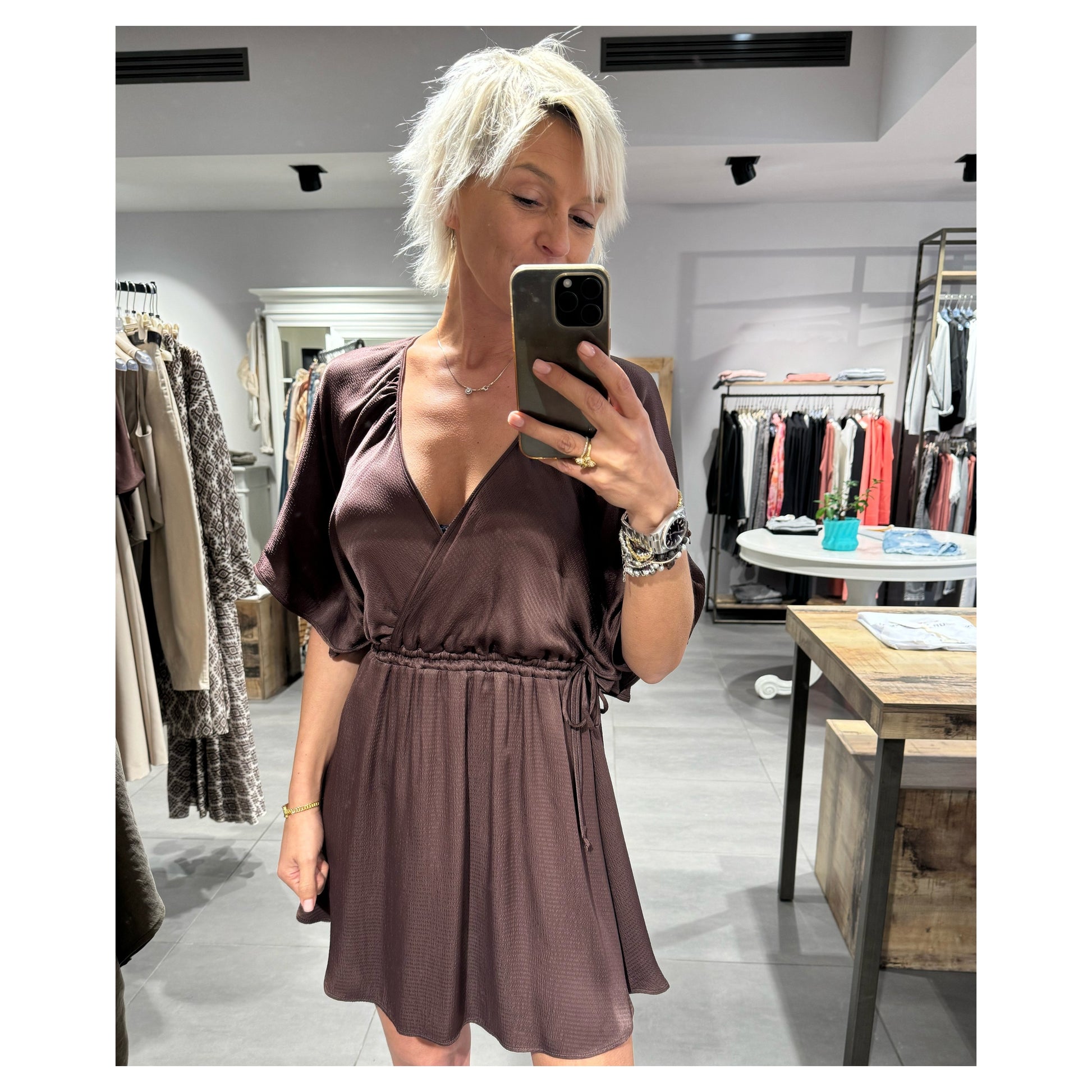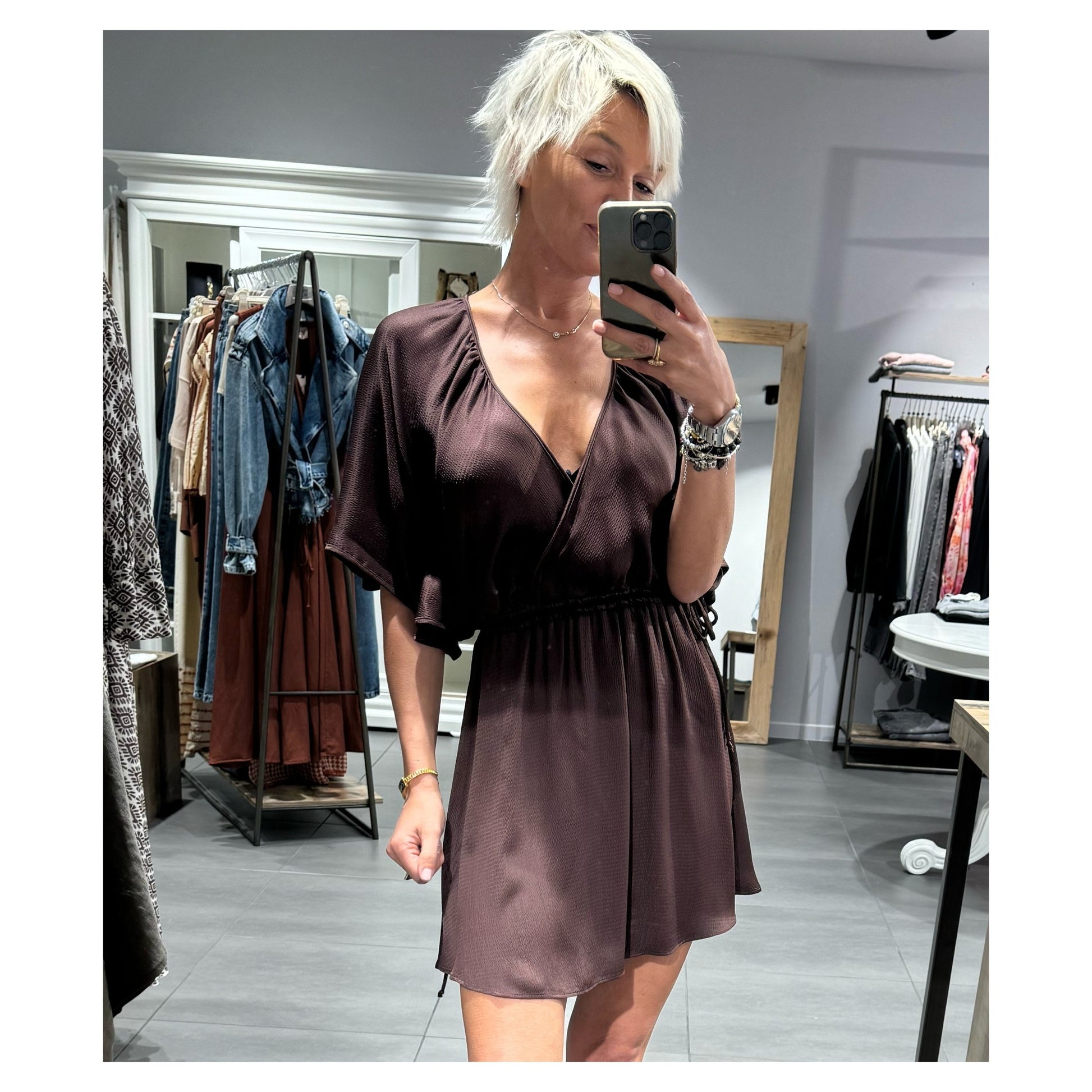 Abito in viscosa scollo a V in una viscosa luminosa. Manica ampia al gomito. Arricciatura in vita regolabile grazie ai laccetti su entrambi i lati.