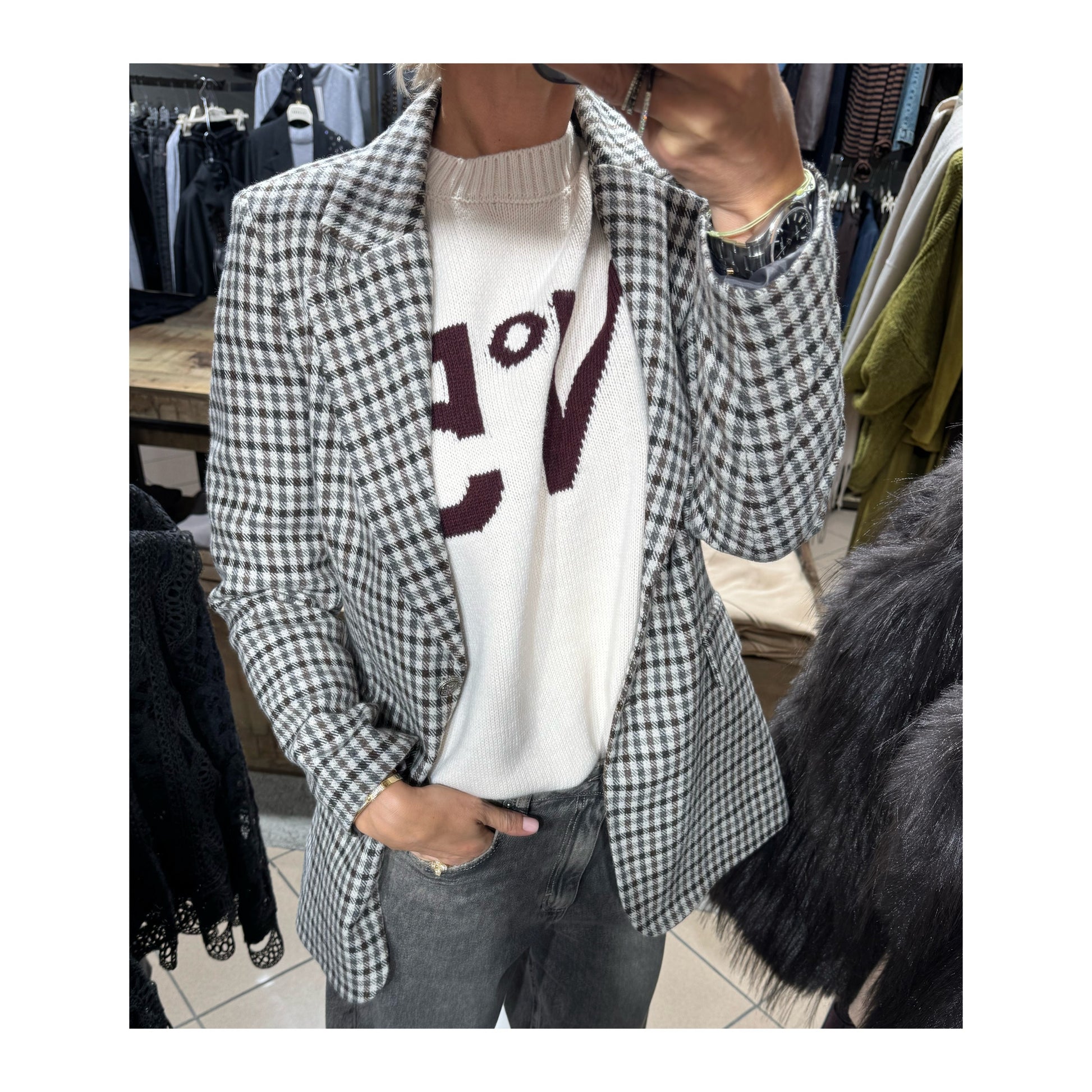 Blazer in misto viscosa doppiopetto caldo con spilline rimovibili. Base burro con check nei toni di nero, antracite e moka