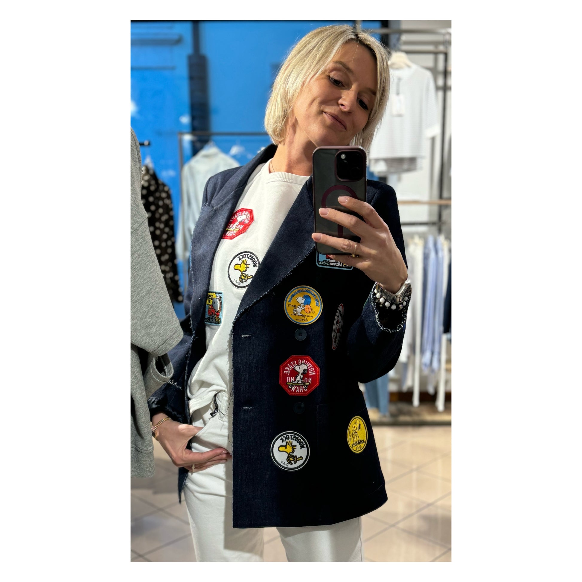 Blazer in denim con patch applicati. Modello doppiopetto.