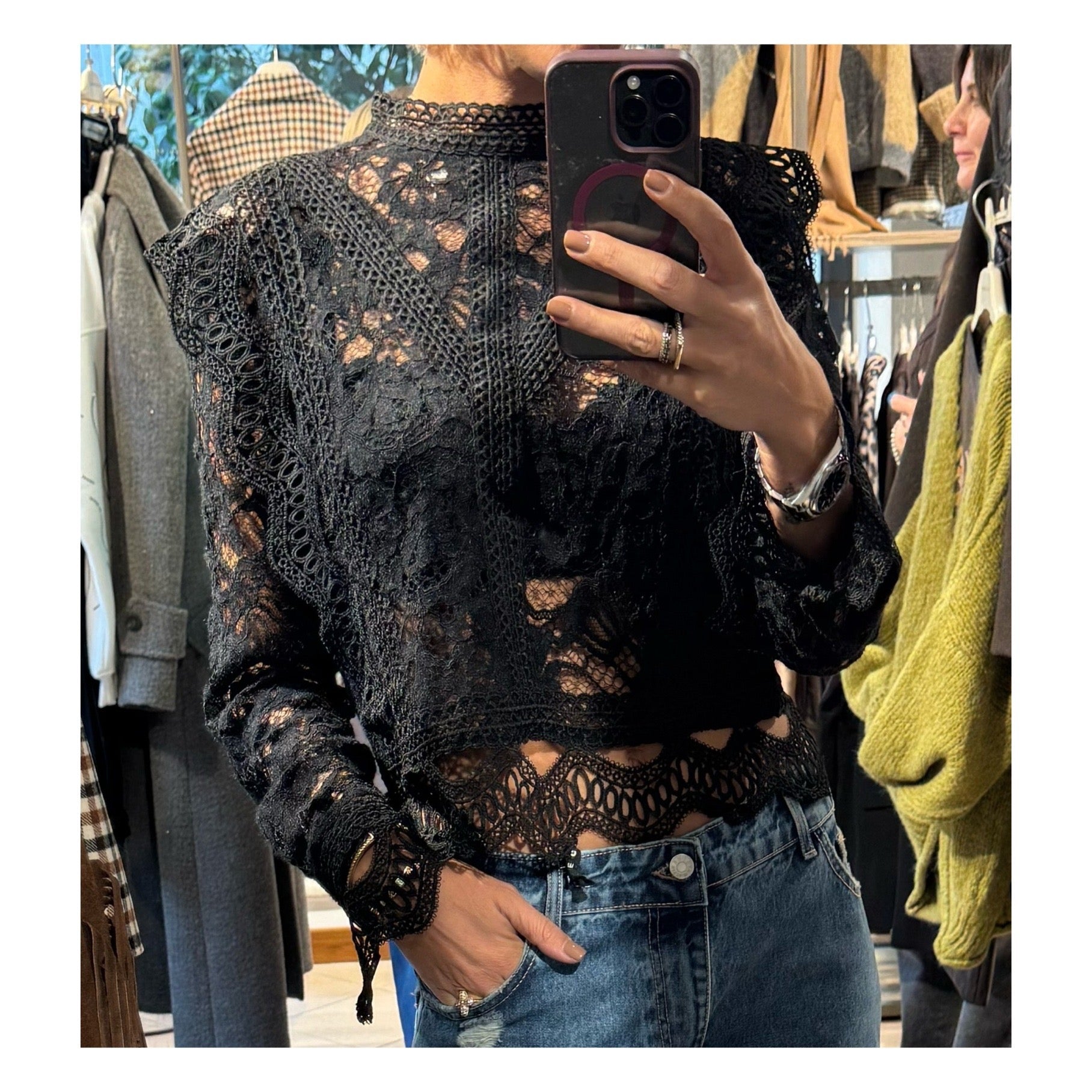 Camicetta a collo rialzato in pizzo. Modello chiuso sul retro dal bottoncino dietro al collo