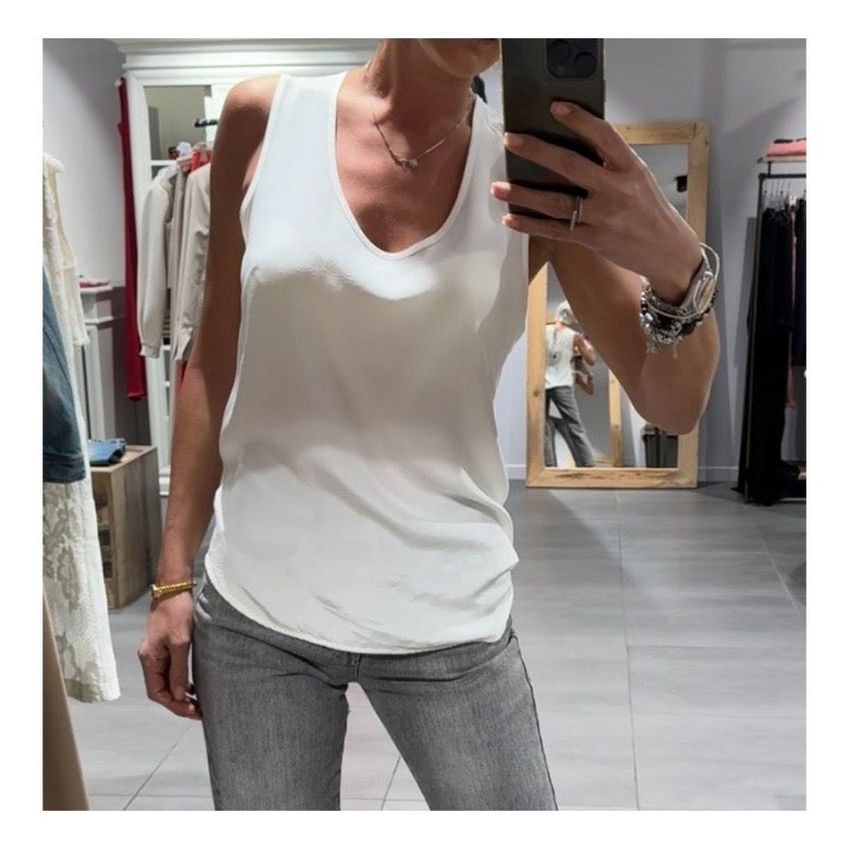 Top scollo rotondo profondo e spallina larga in rayon. Vestibilità regolare lunga.