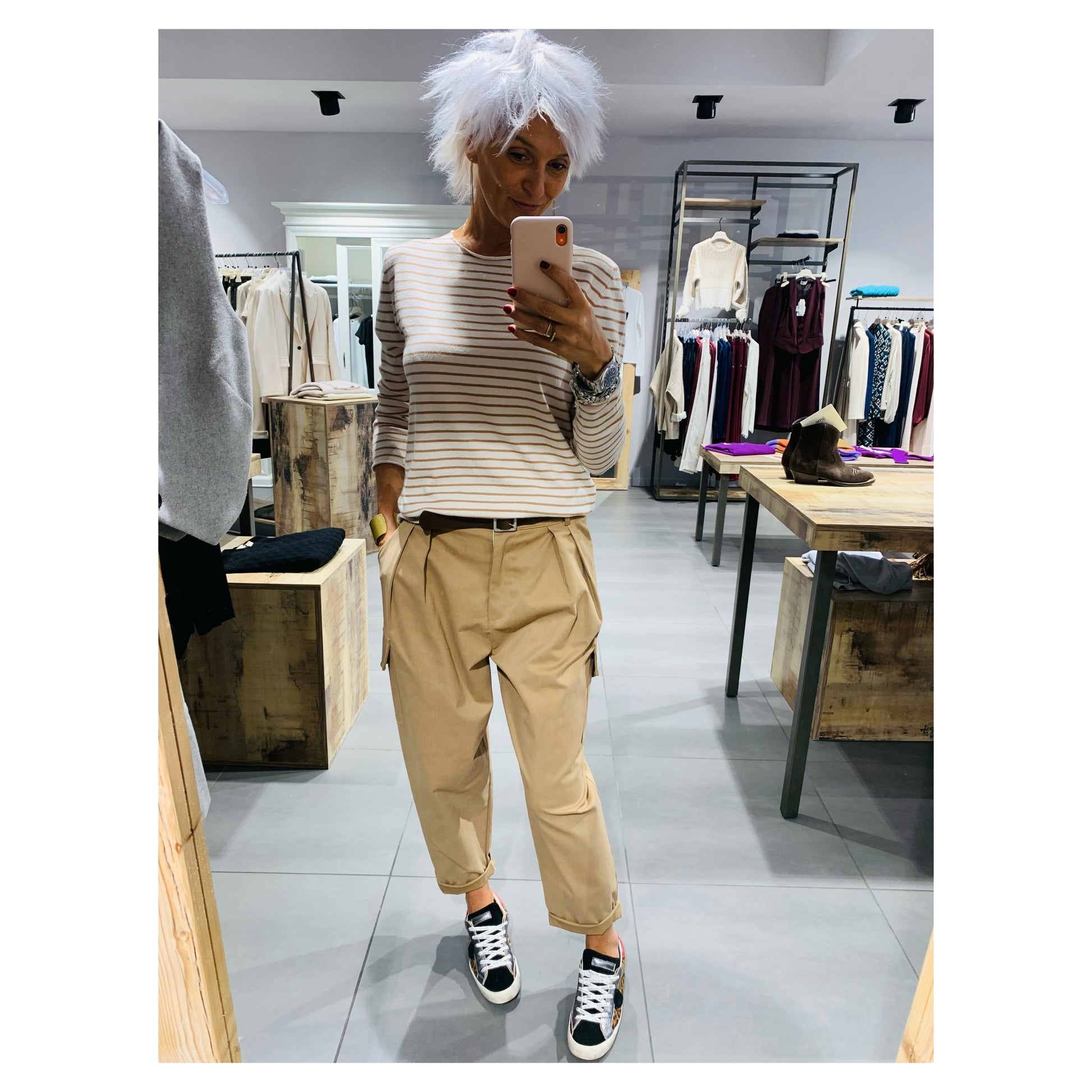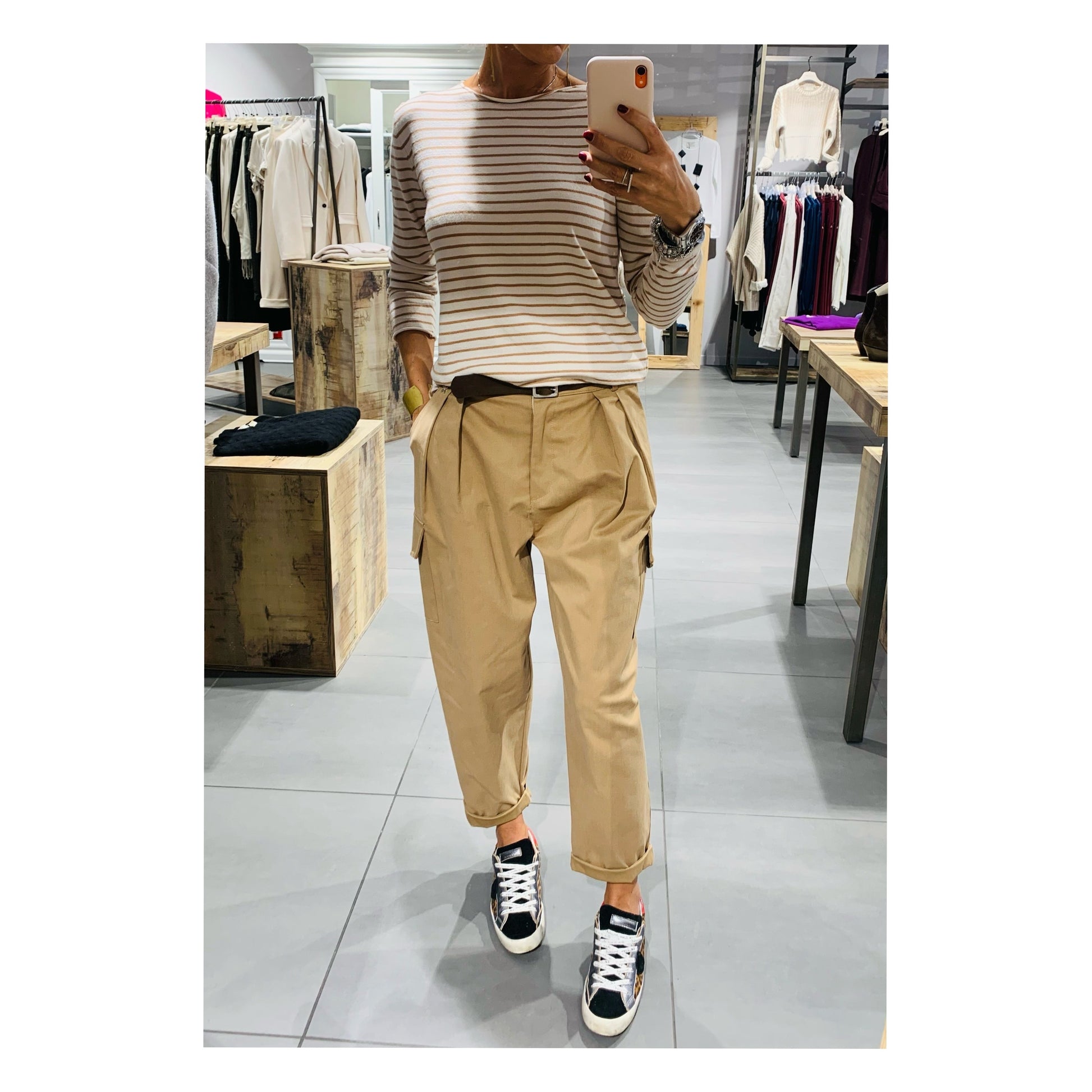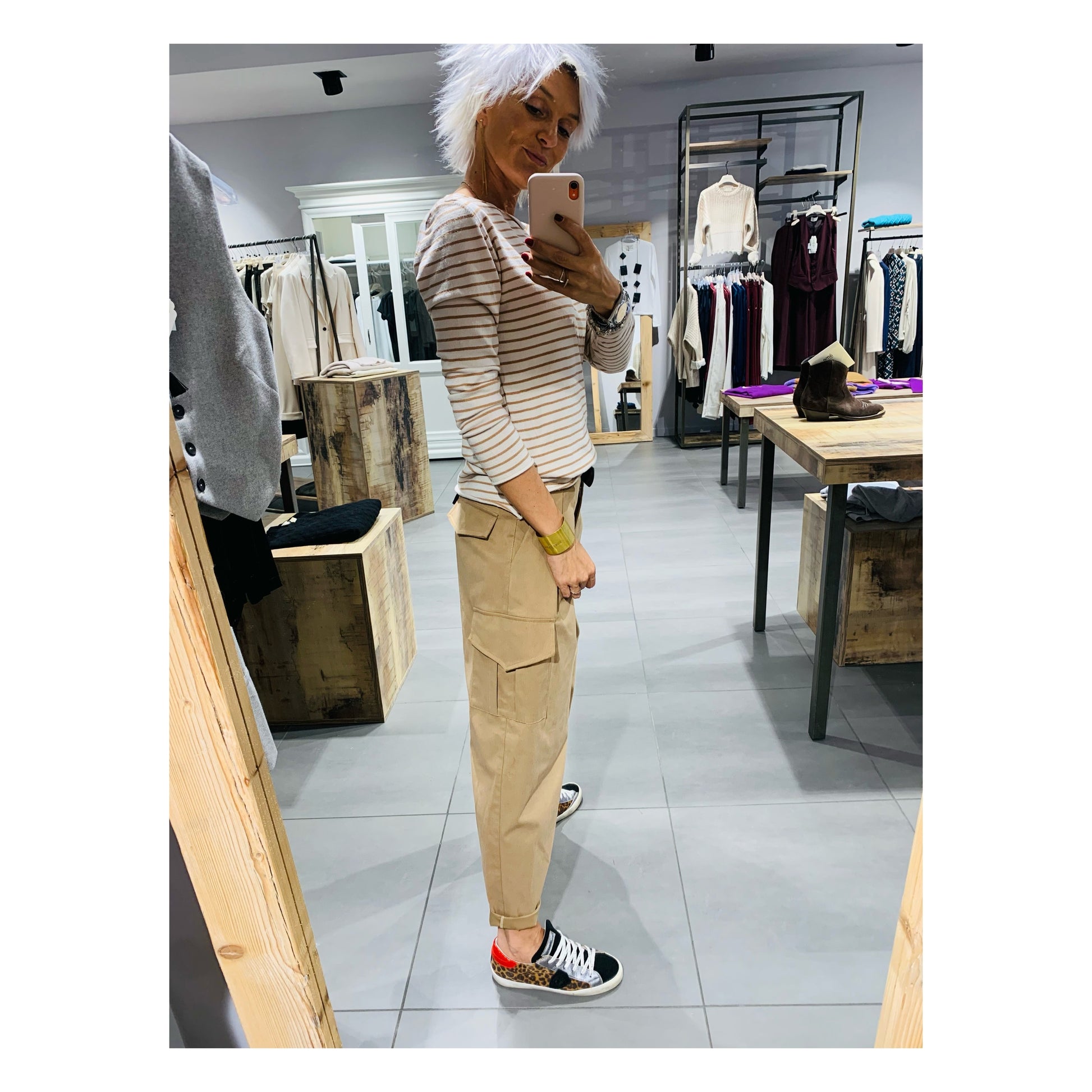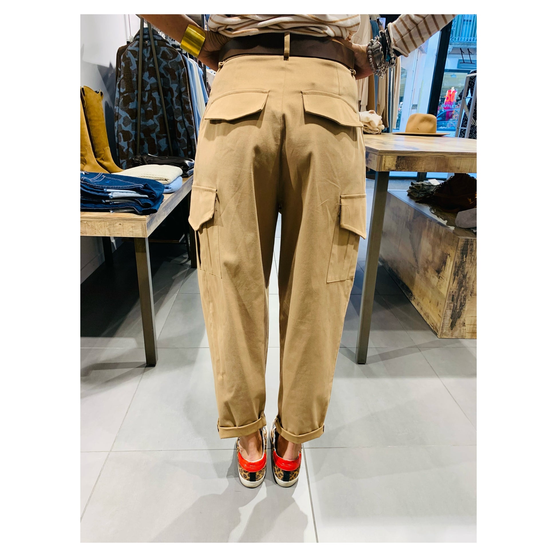 Pantalone modello cargo in cotone con tasconi laterali e pence frontali. la tasca sul retro ha soltanto il risvoltino. Vita media.