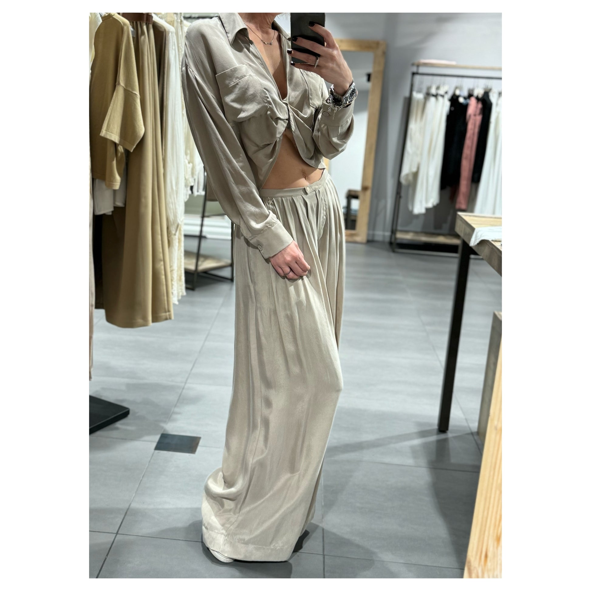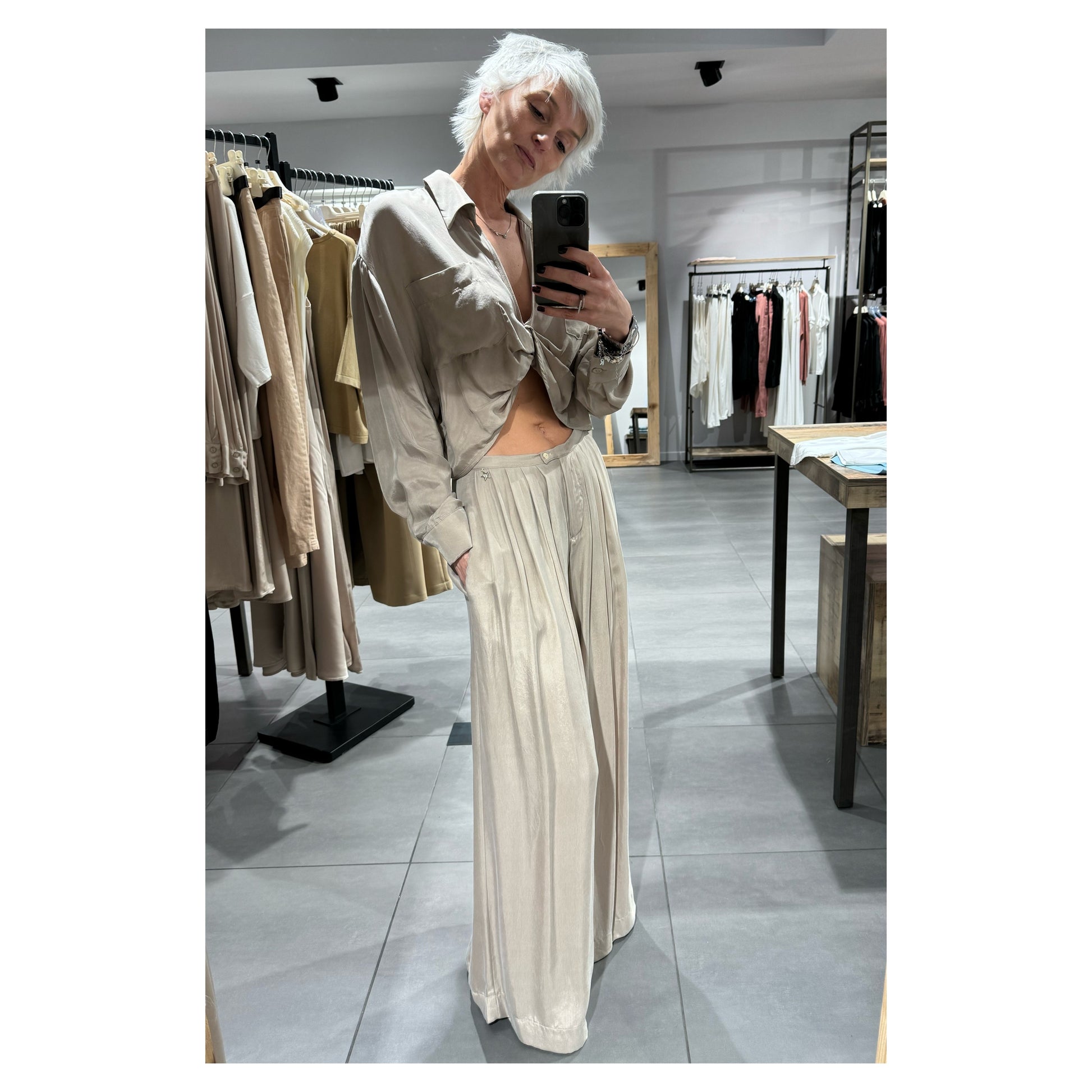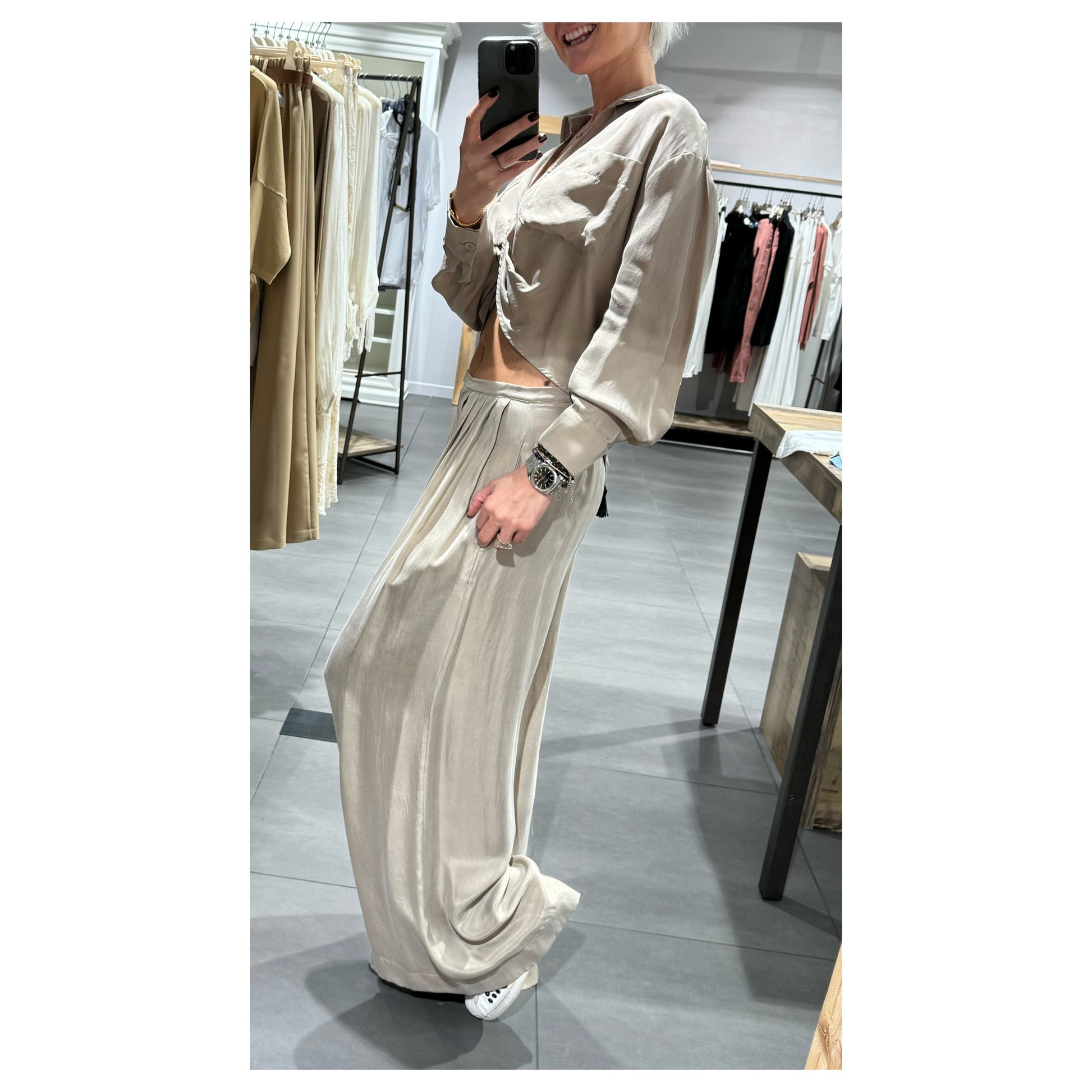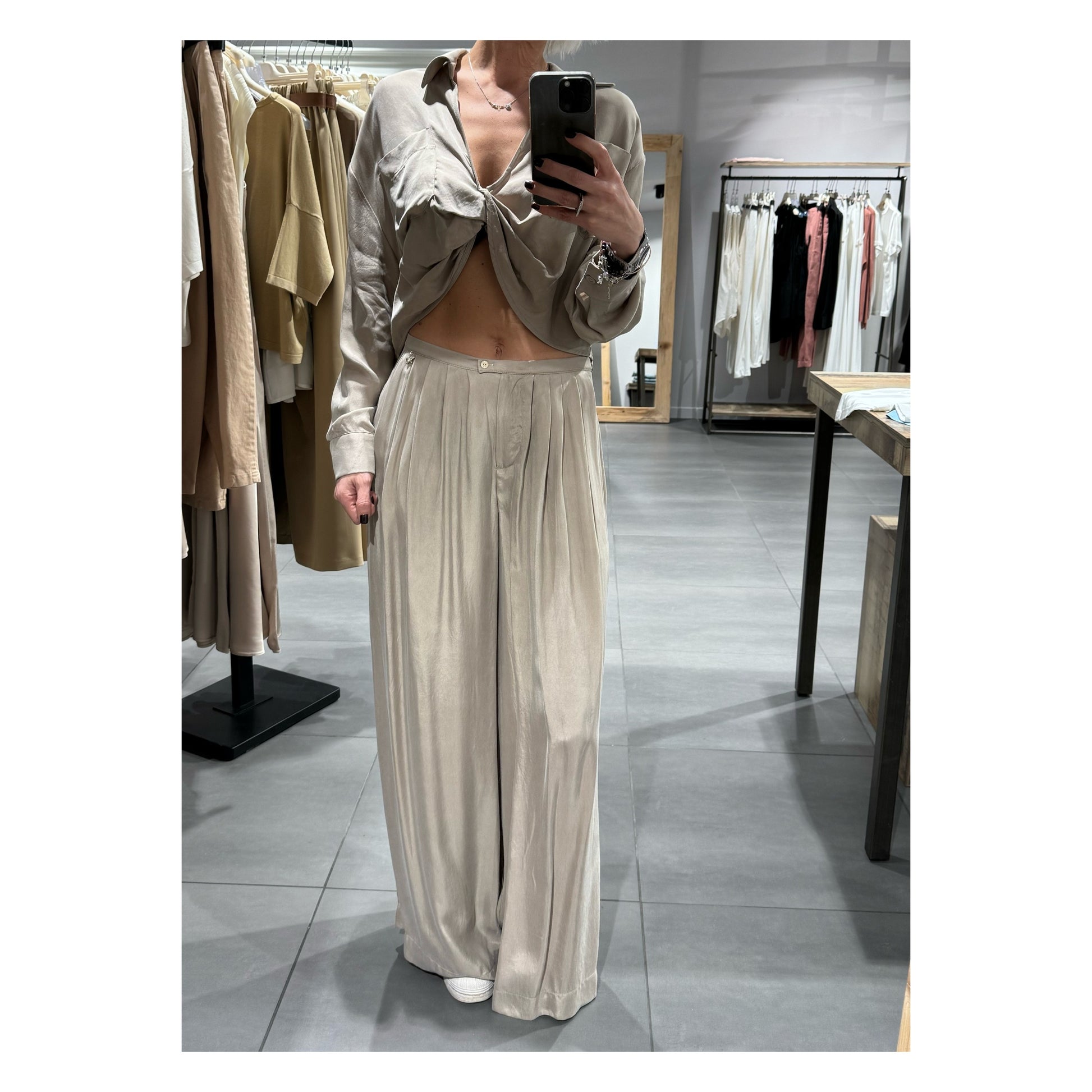Completo in viscosa con effetto spalmato. La camicetta ha la spalla scesa e incrocio sotto il seno con un effetto simile a un nodo. Pantalone a palazzo con minipence e bottoncino e zip.