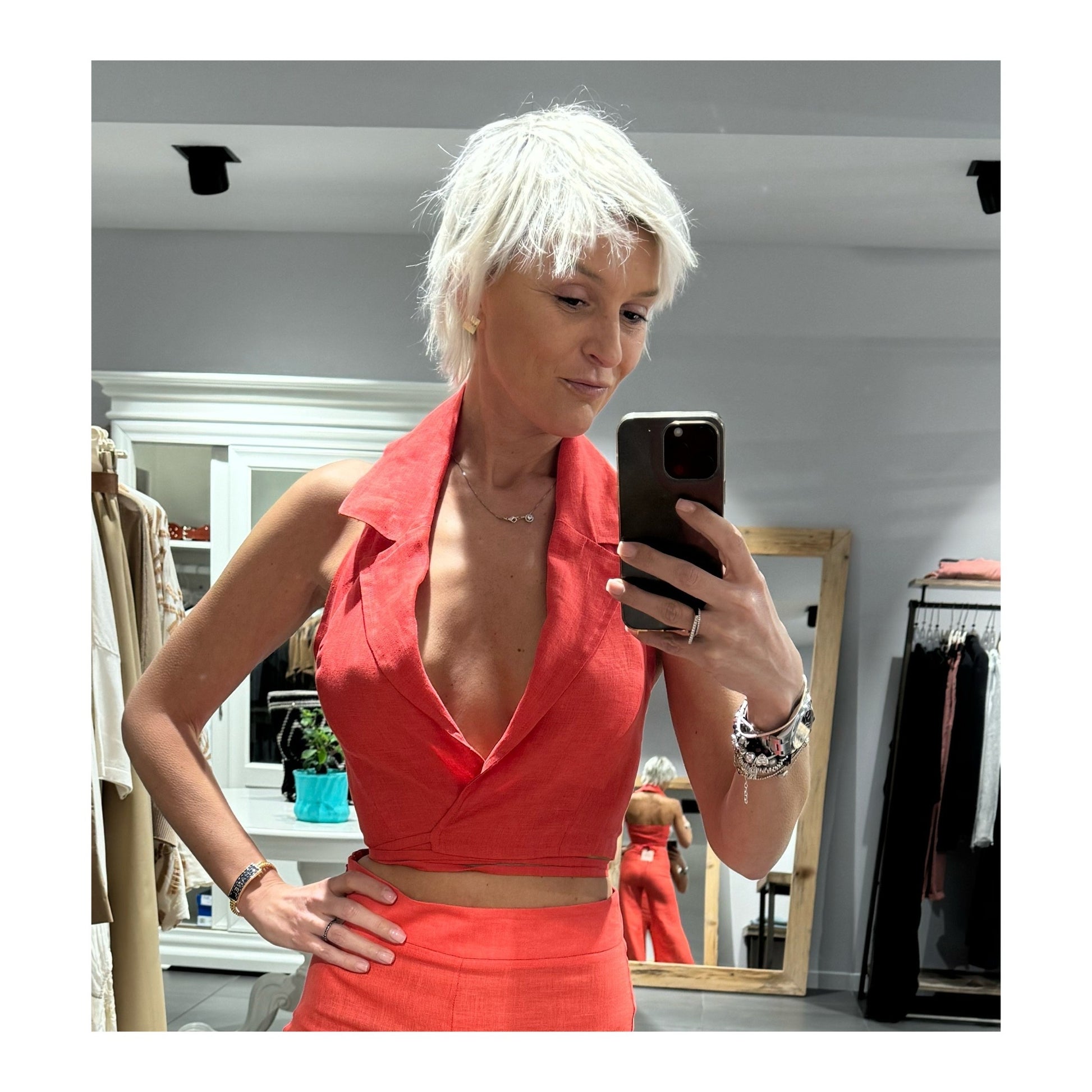 Gilet in lino con schiena scoperta e collo all’americana con rever. Regolabile con il laccetto intorno alla vita. Modello dalla vestibilità regolare.