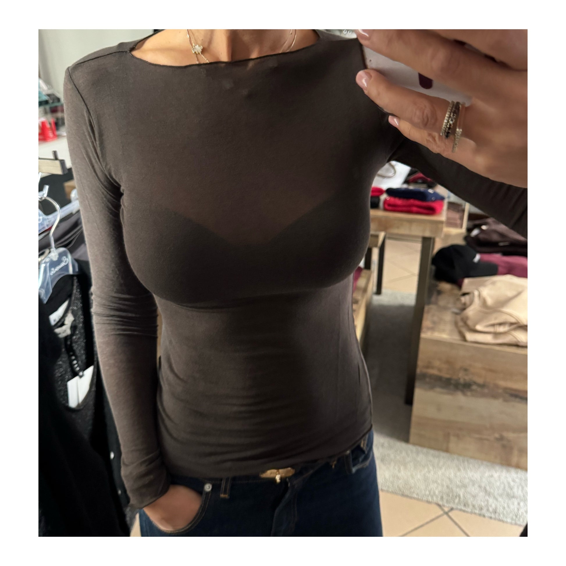 Magliettina in misto cachemire caldo leggermente trasparente con collo a barchetta