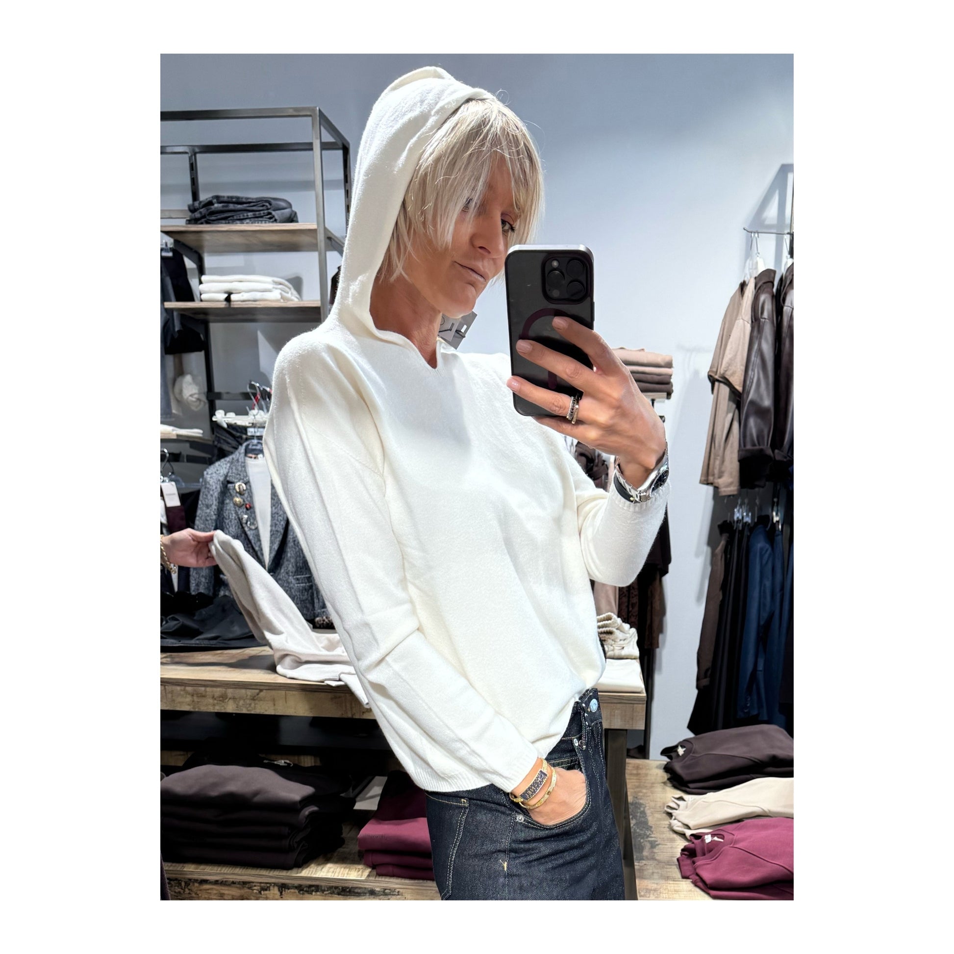Maglioncino con cappuccio e scollo a V. Modello morbido in misto viscosa.
