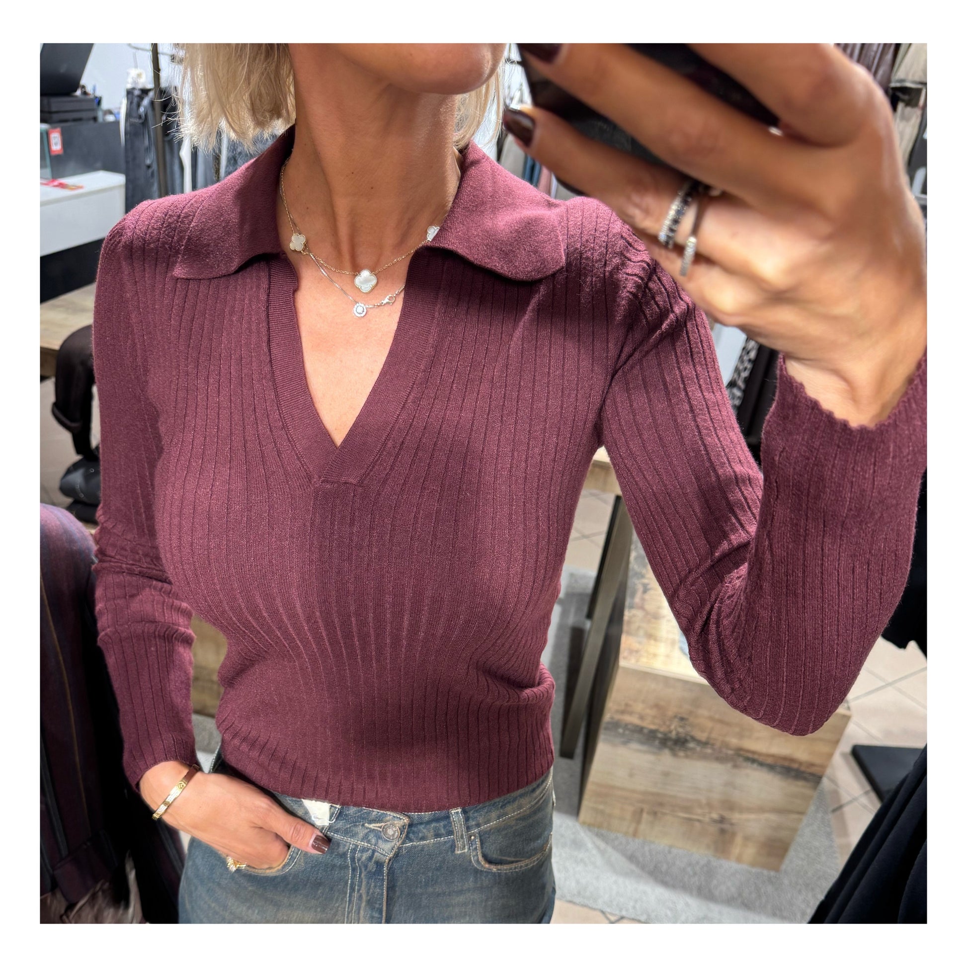 Maglioncino a costine larghe con collo a polo e scollo a V in misto viscosa