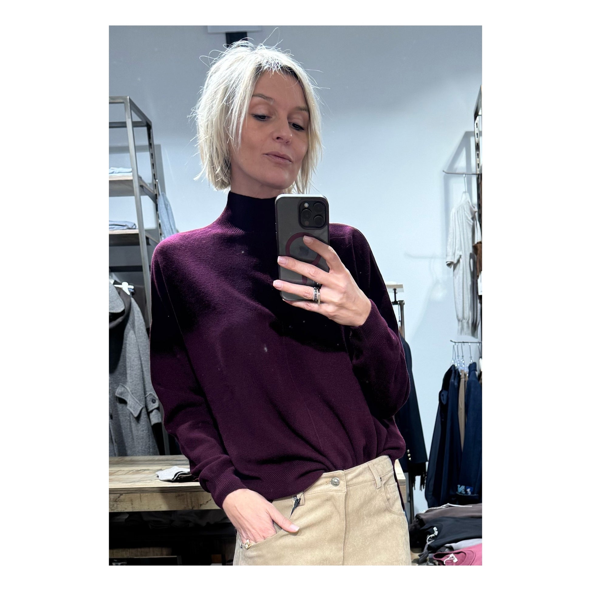 Maglioncino in 100% lana morbidissimo a collo rialzato e cucitura frontale. Modello con spacchettino laterale