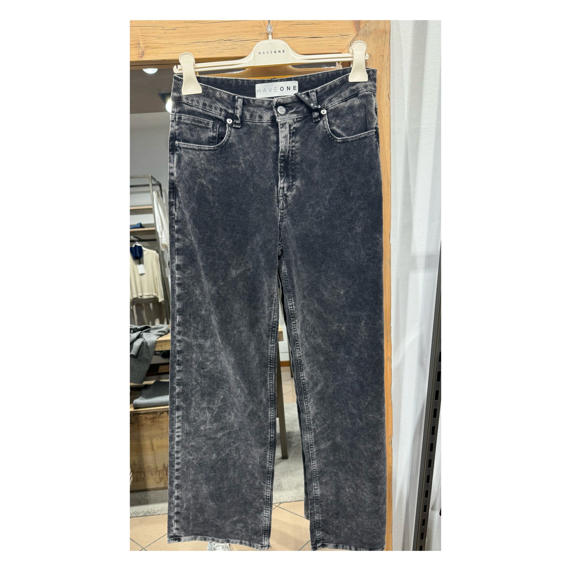 Pantalone in velluto mille righe. Modello cinque tasche a gamba dritta.