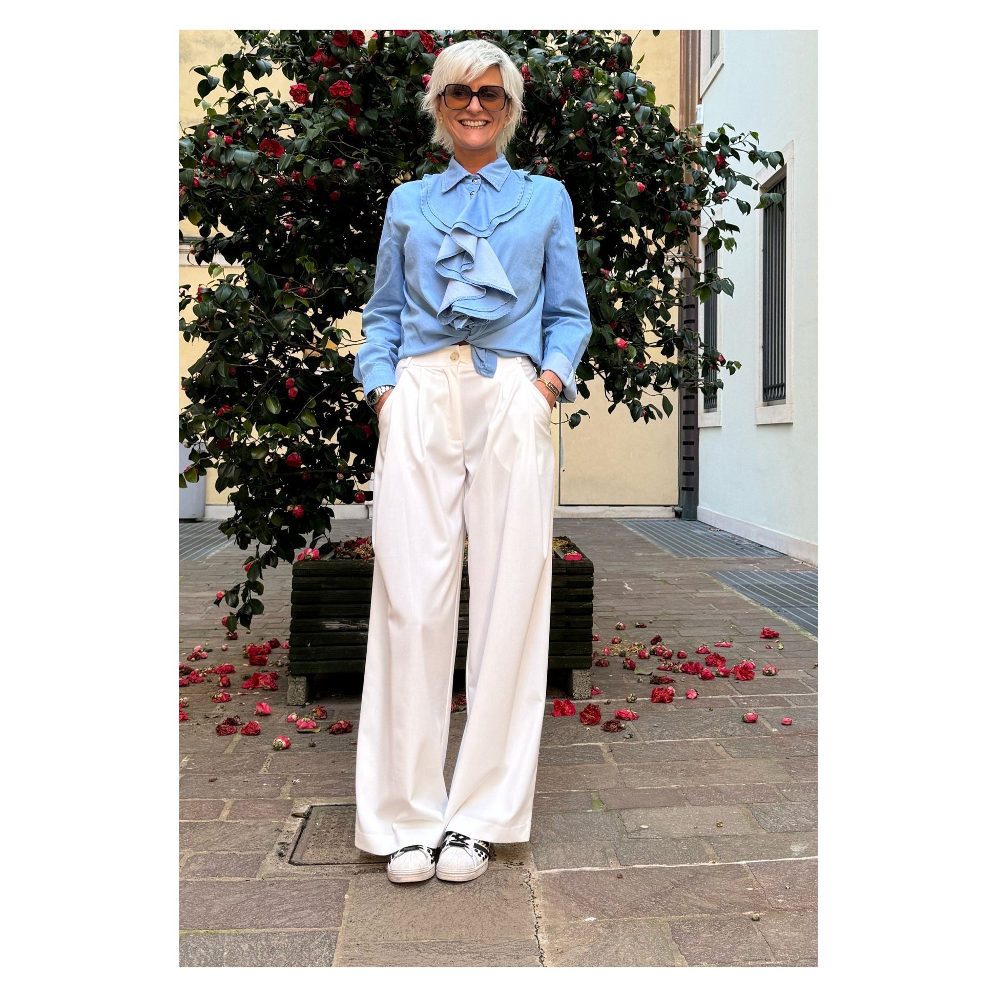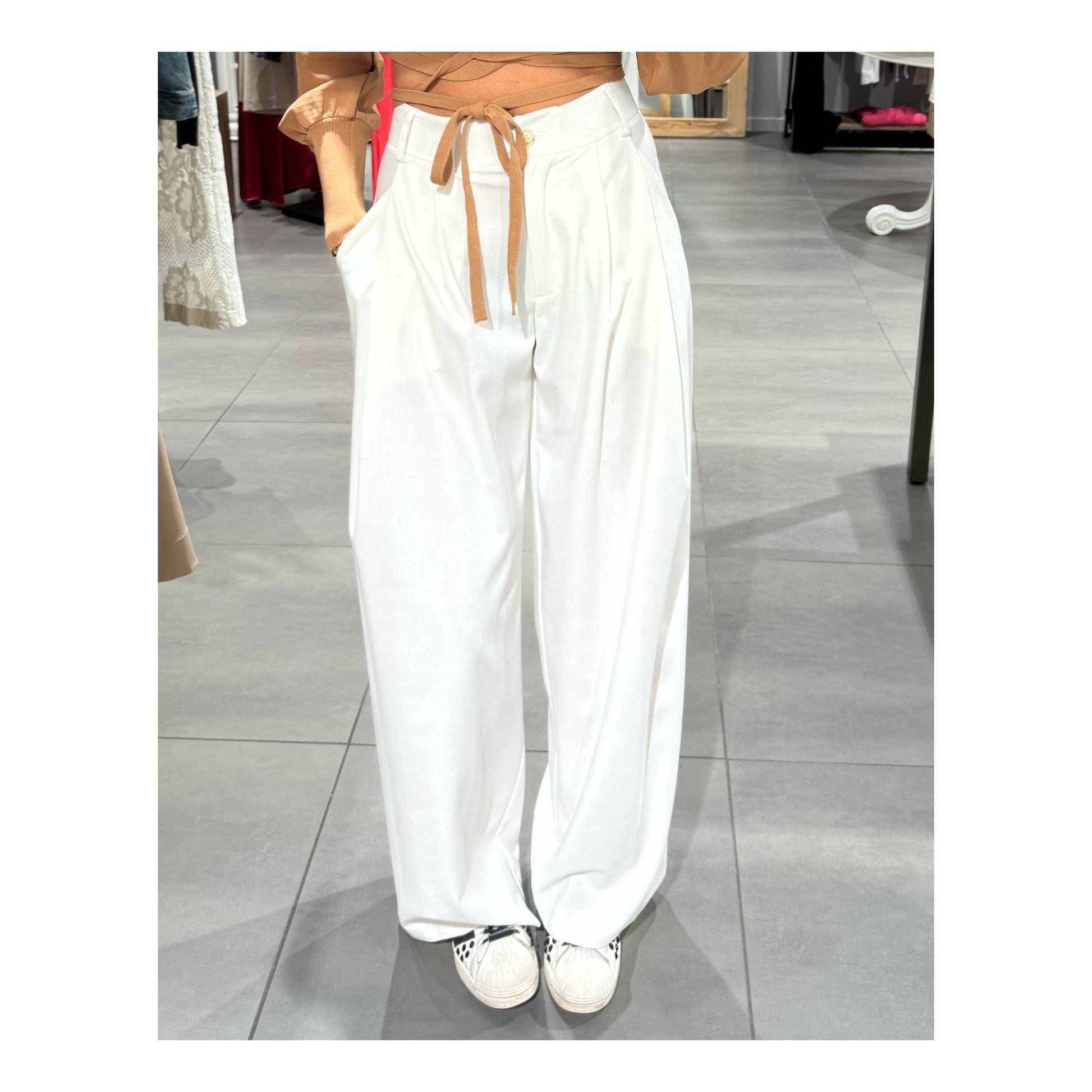 Pantalone a palazzo in viscosa di cotone con tasca diagonale laterale e taschino sul retro. Modello a vita alta con pence. Vita alta, a livello dell’ombelico. Modello dalla vestibilità regolare.