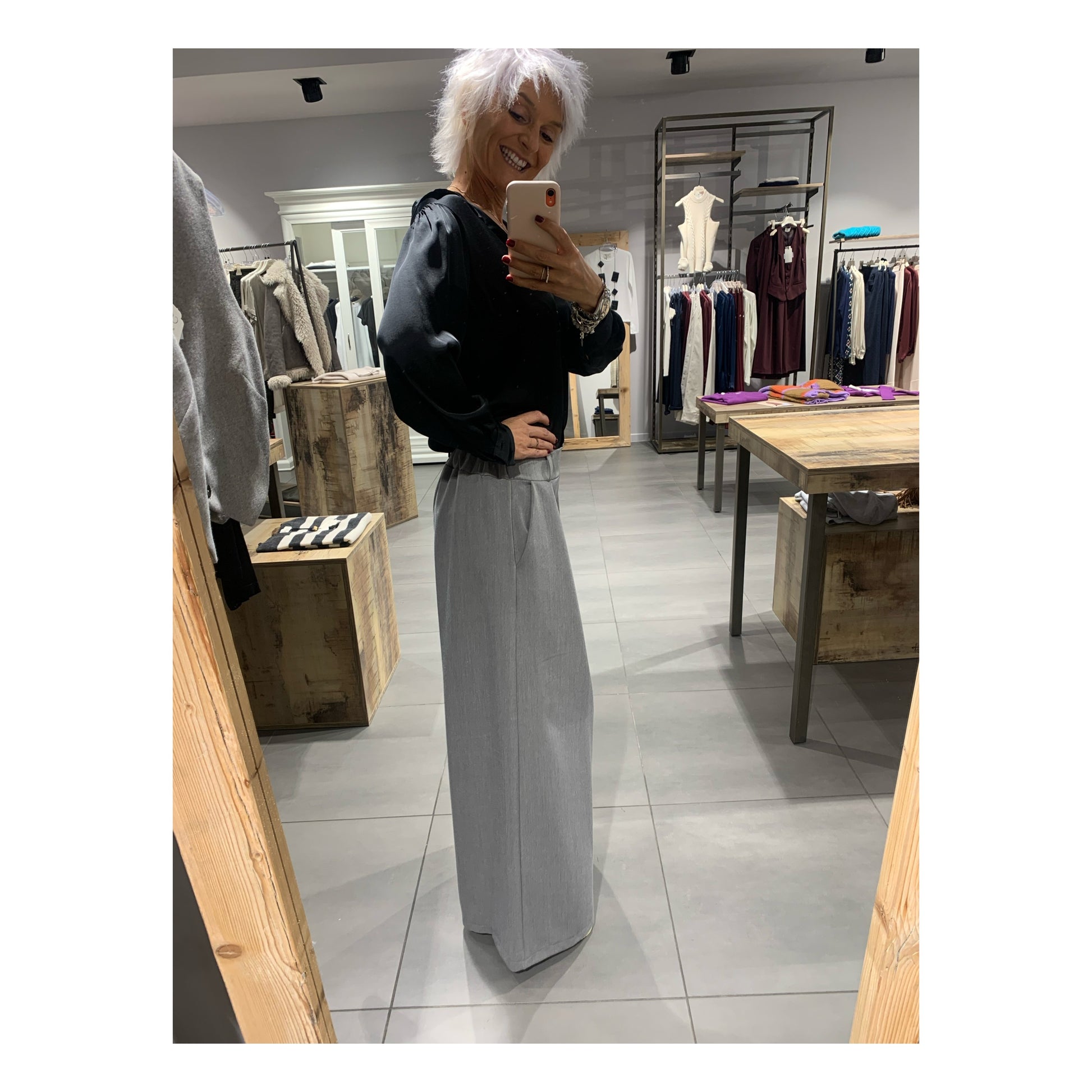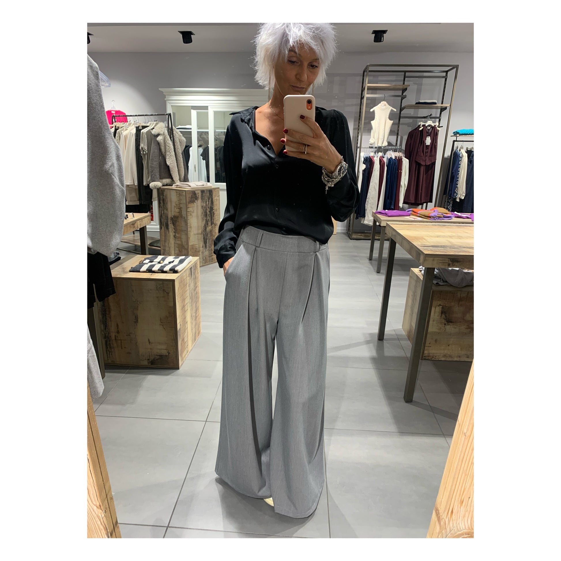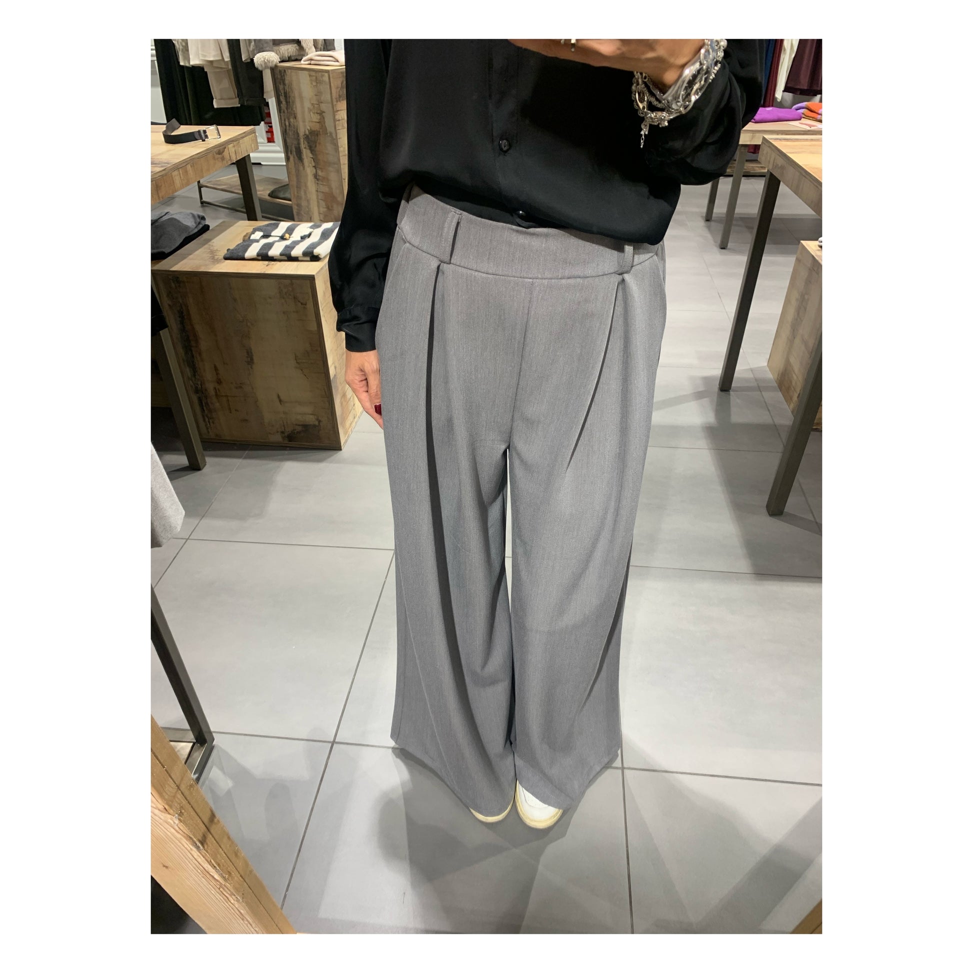 Pantalone palazzo con coulisse senza bottone e zip da infilare. Pence piatta svasata che allunga la figura