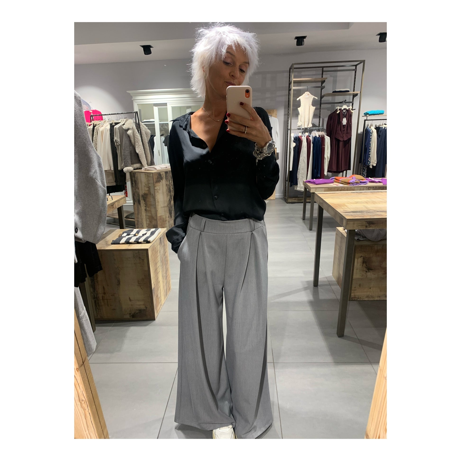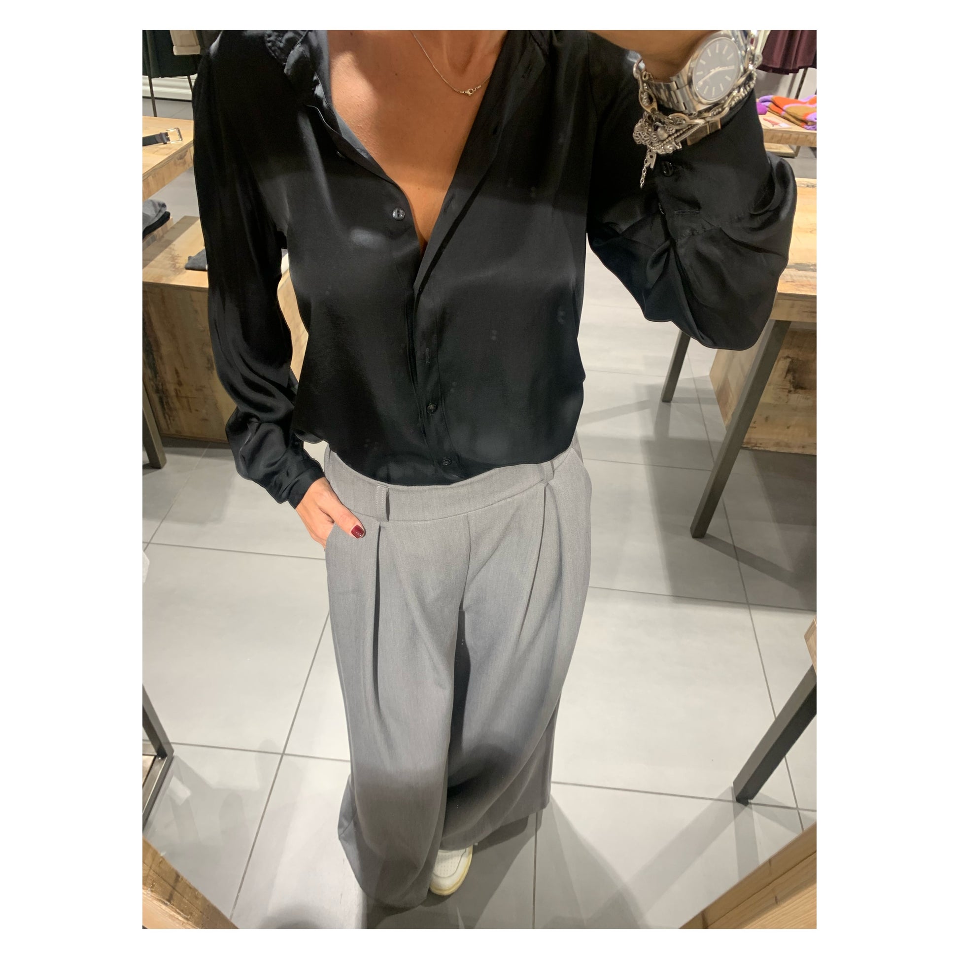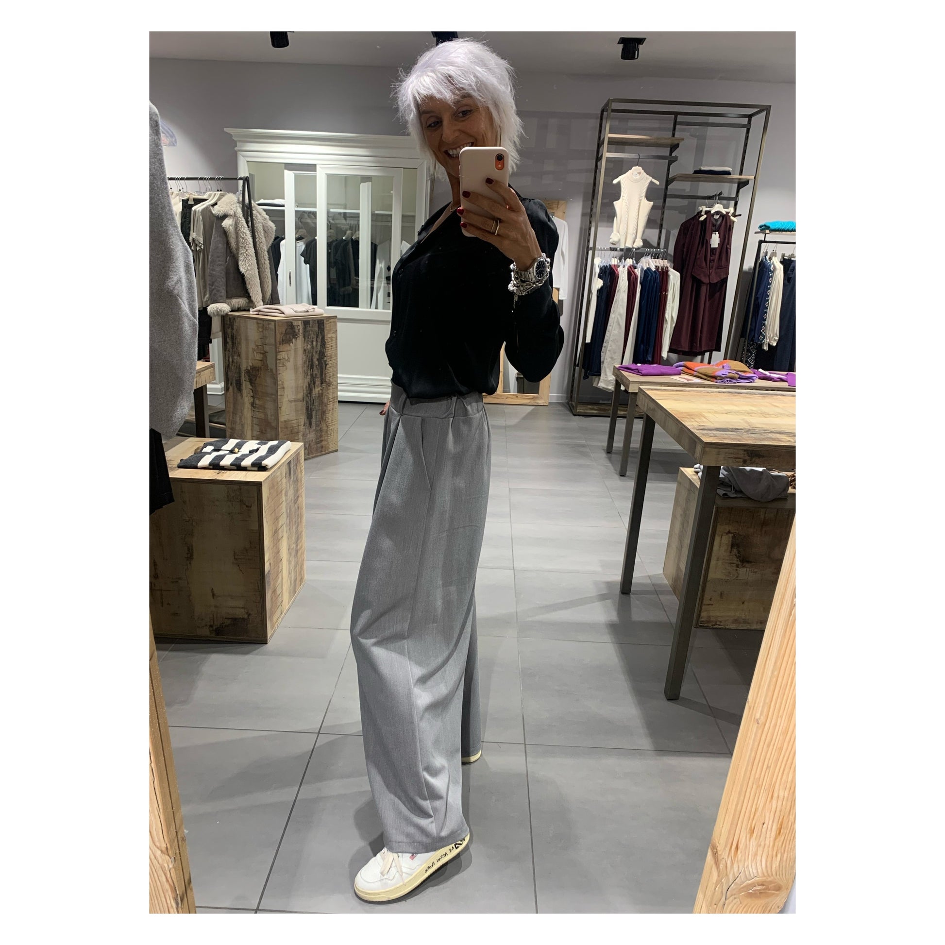 Pantalone palazzo con coulisse senza bottone e zip da infilare. Pence piatta svasata che allunga la figura
