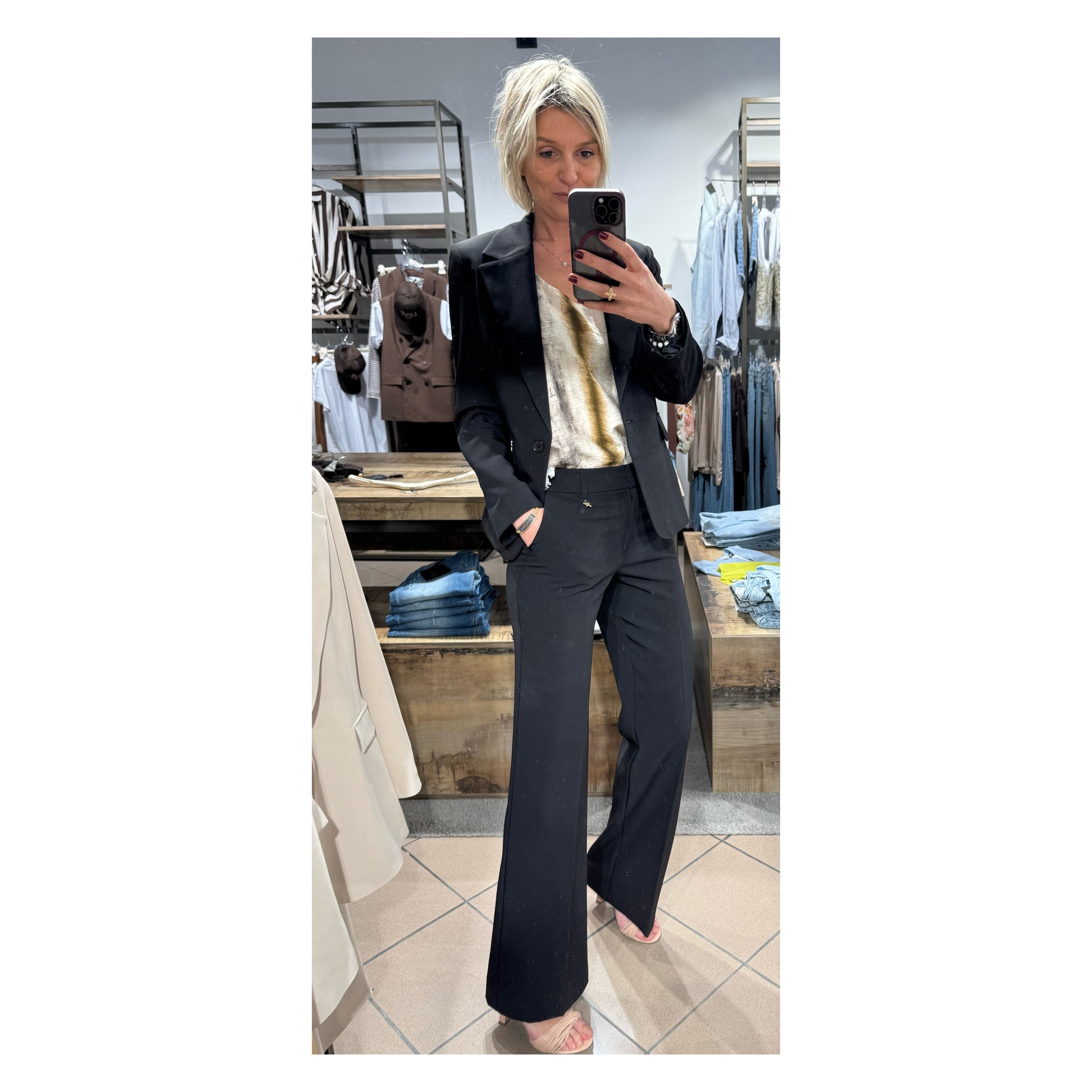 Completo in tessuto tecnico composto da pantalone a gamba ampia e blazer slim monopetto.
