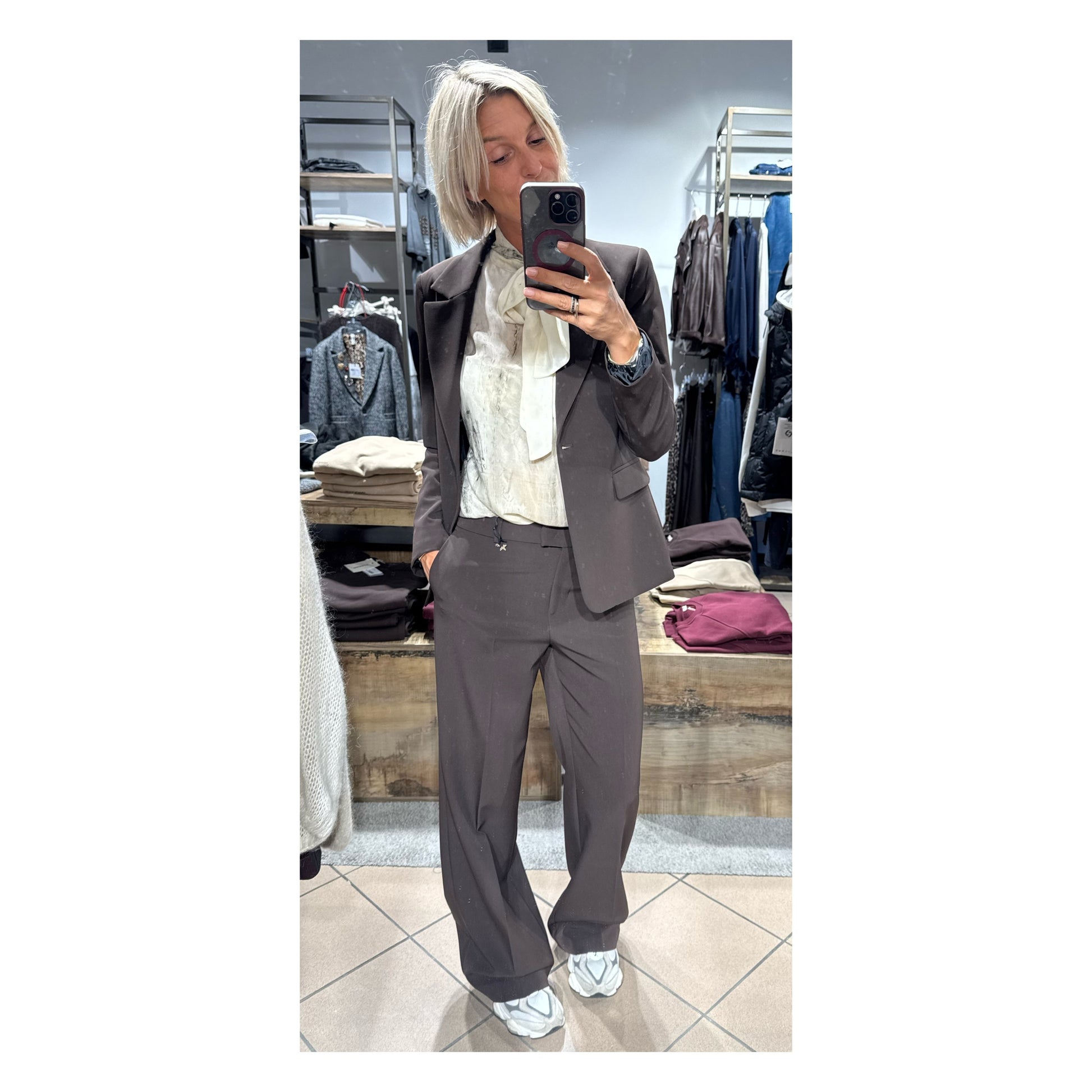 Completo in tessuto tecnico composto da pantalone a gamba ampia e blazer slim monopetto.