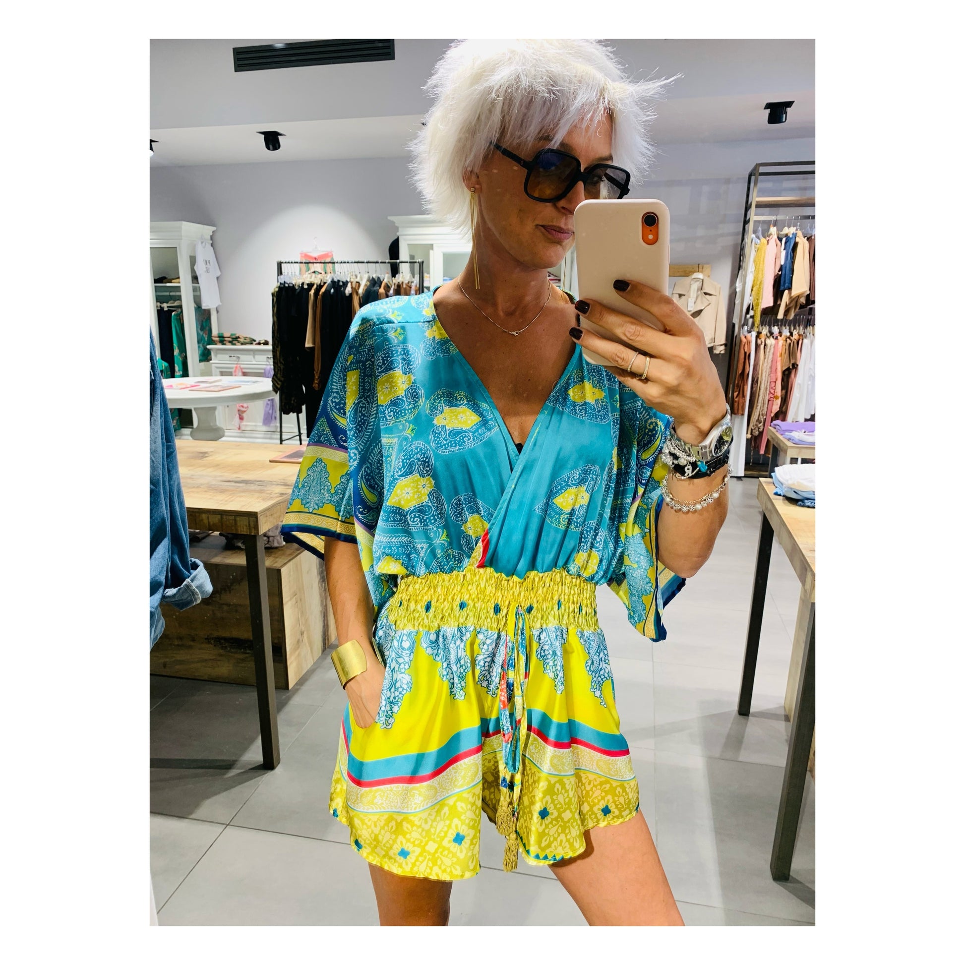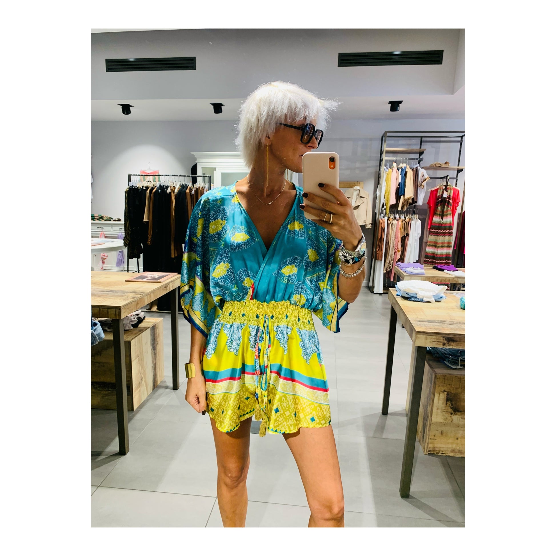 Tuta corta con coulisse in vita e scollo profondo ma non esagerato. Si può indossare comodamente qualsiasi reggiseno. Manica ampia che rende la tutina fresca anche nei giorni più caldi.